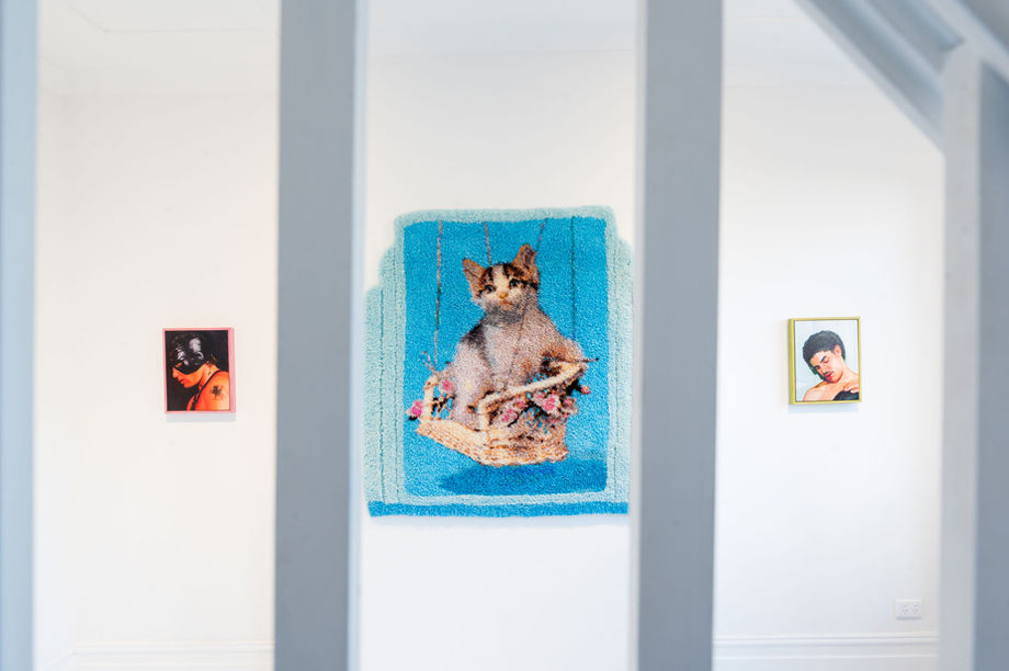 oil on panel, polyester satin, polyester fibre stuffing, wood.